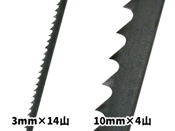 [用途のめやす]3mm×14山:最も細かい曲線挽き・平滑な切断面。太めの糸鋸刃くらいの細かい曲線加工が可能。おもちゃ、カトラリー、彫刻作品など。