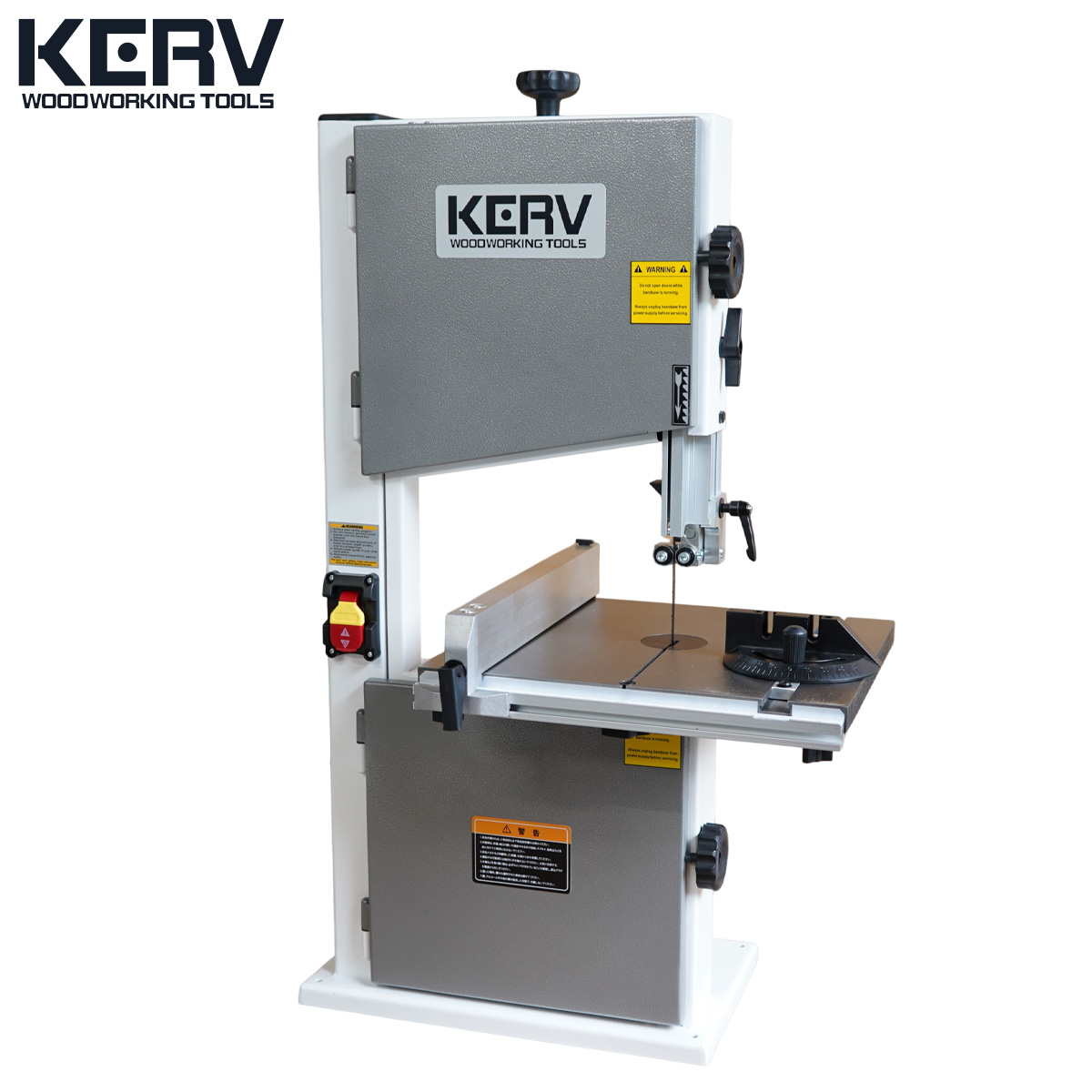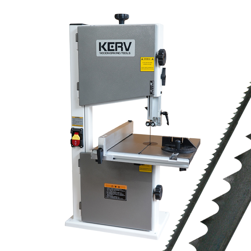 テーブルに向って上から下に垂直に切り下しているので、丸鋸やチェンソーのようなキックバックが起こらず、直線も曲線も手軽に安全に挽くことができるのがバンドソーの美点。