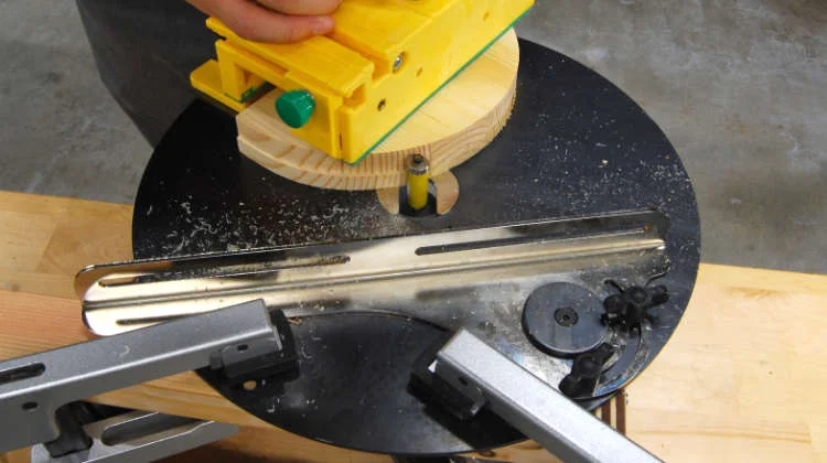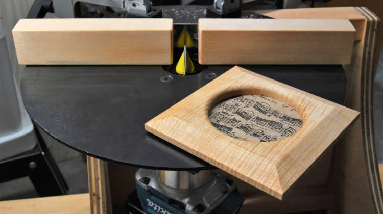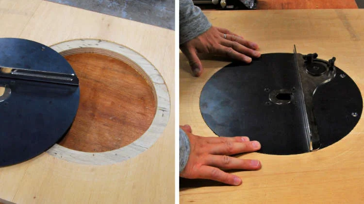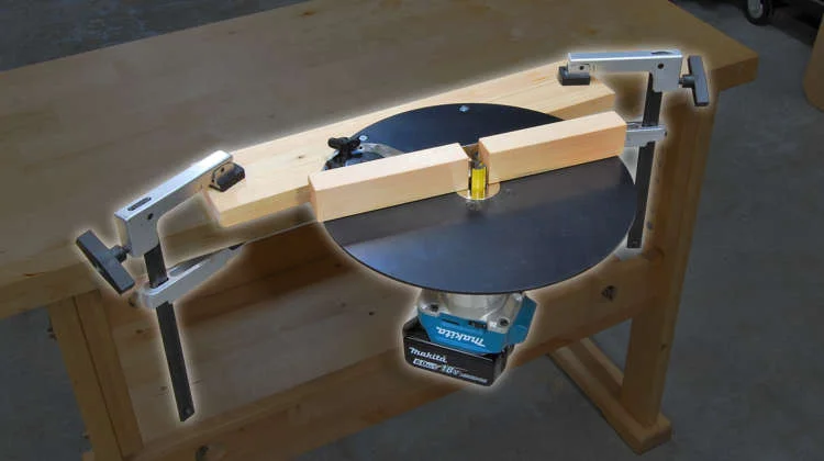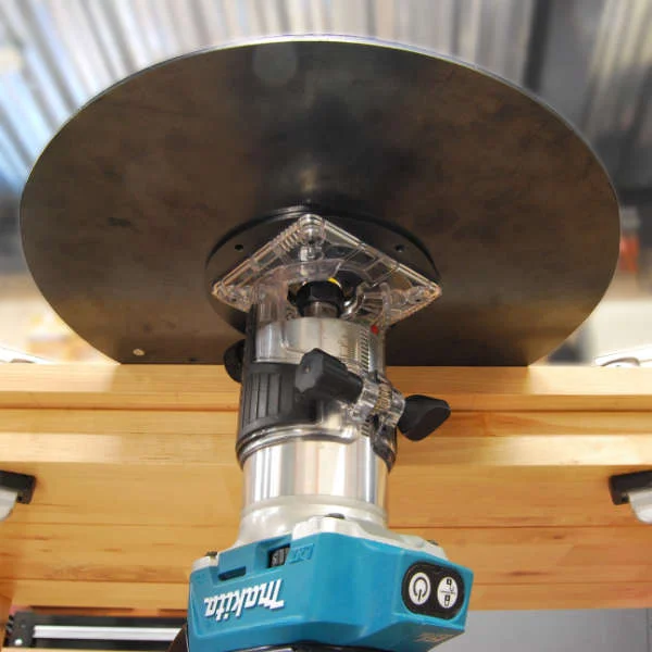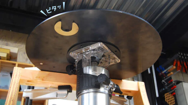 合板を、サークルカットジグ「トリマル君」で丸く繰り抜いて、丸い「おとりやす」を埋め込んでみました。大きなテーブル面を持つトリマーテーブルに変身です。
