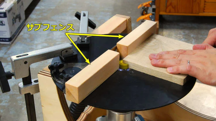溝加工は1軸旋回フェンスだけで加工できますが、面取りや、段欠きをするときに必要なのが「サブフェンス」。短い木製サブフェンス2本が付属しています。左右セパレートしたタイプなので、ビットの刃径に合わせて開口幅を変えられます。