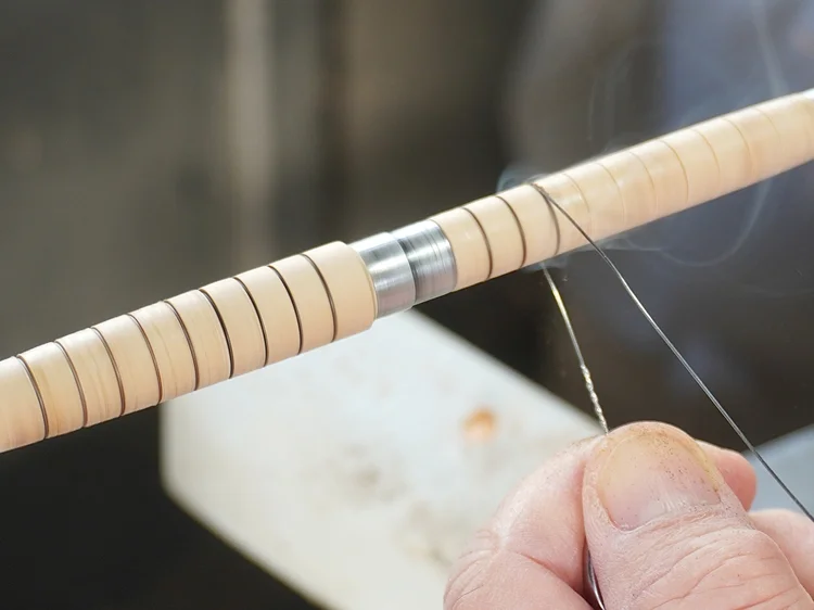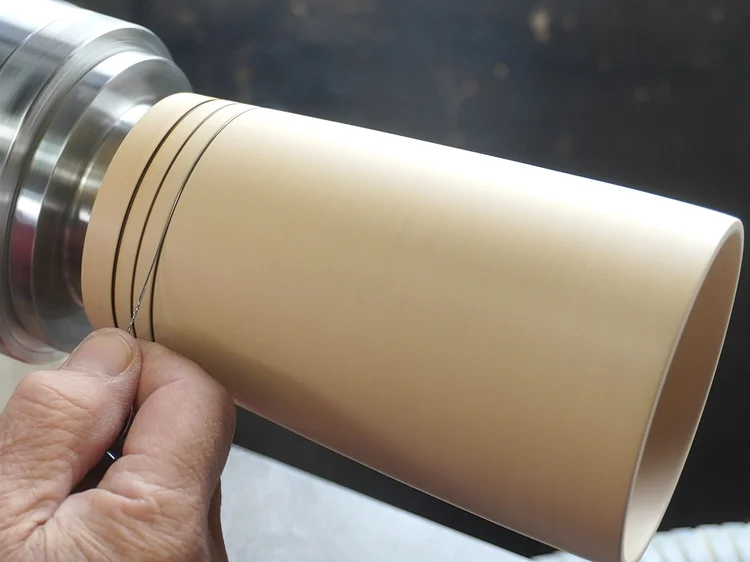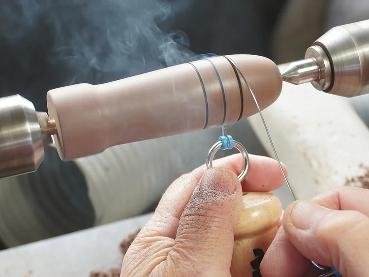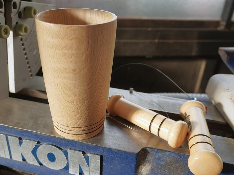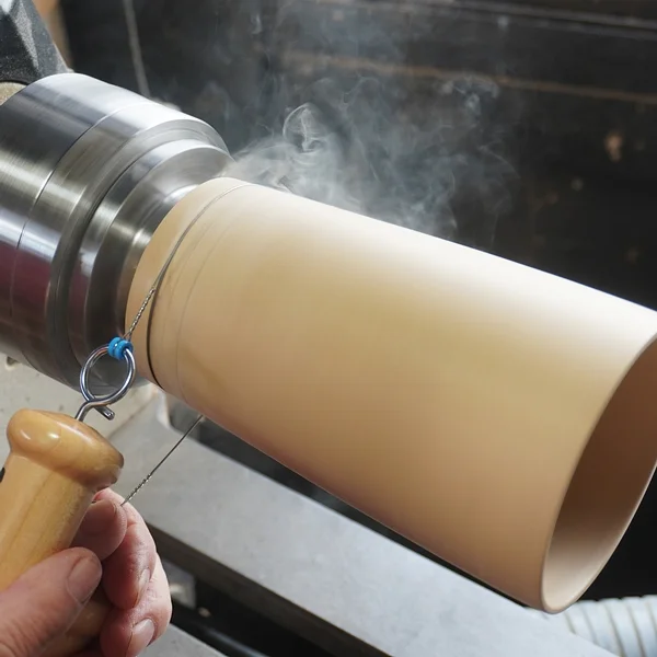ワイヤーバーニング(Wire Burning)とは、木工旋盤における装飾技法のひとつ。回転する木材にワイヤーを押し当て、摩擦熱によって細い線状の焦げ目を付けます。さりげなくかつ効果的にアイキャッチを施すことができます。