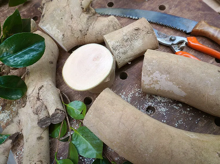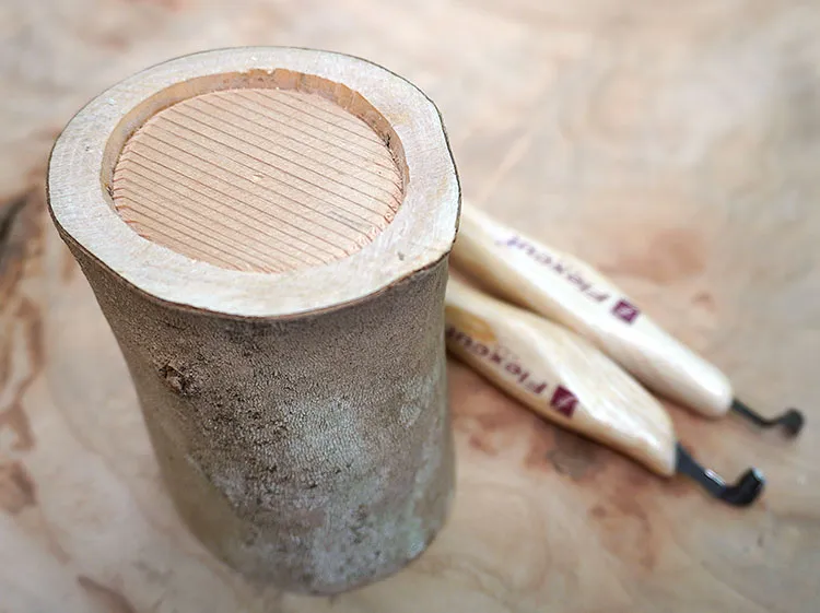 玉切りした枝材の中心にドリルで穴をあけ、主にストレートナイフで筒状に削り、筒の内側に少し緩めの乾燥した板をはめると、生木の筒が乾燥して縮んで底板が固定されるのです。