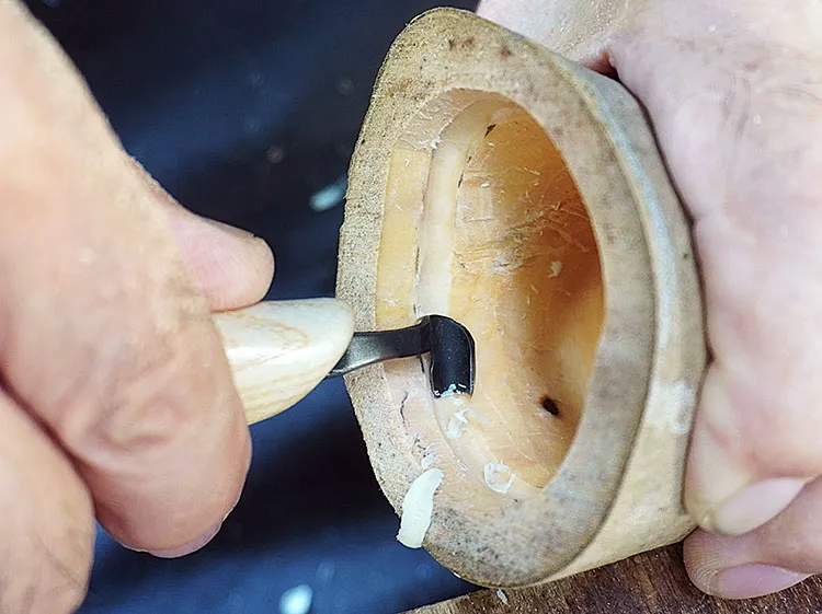 底板がはまる筒の内壁の溝は、一般的にはストレートナイフの切っ先(先端)を使って加工するのですが、その作業は容易ではありません。