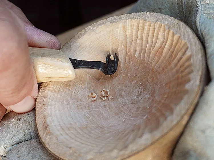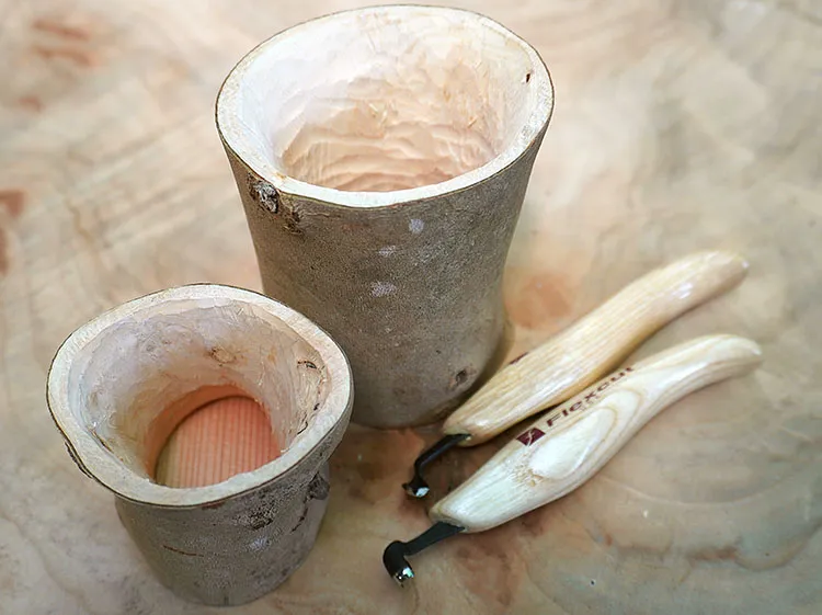ただし、作品の形状や目(繊維方向)によって押して削る方が扱いやすいこともあるので、左右一対そろえるとさらに使い勝手がよくなります。上右図は「レフト」を右手で持って押している様子です。