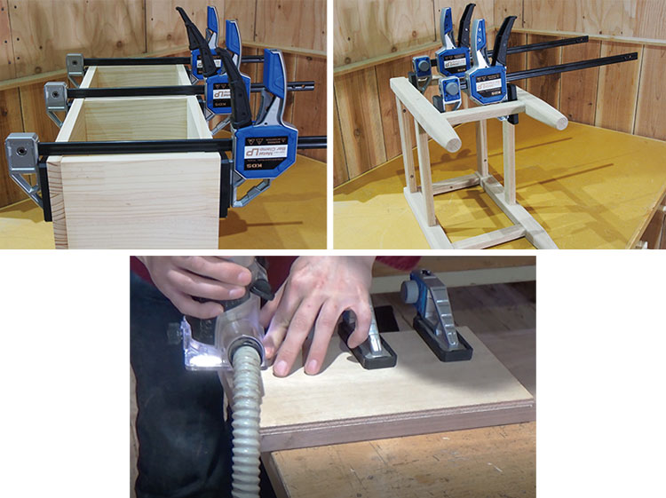 【使用例】 木材の加工時(切断、ほぞ加工等)の作業台への固定(強力な締付け)