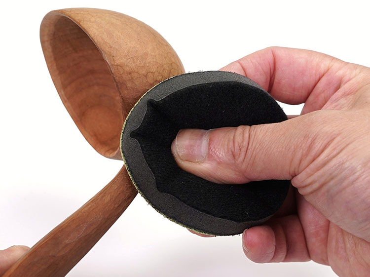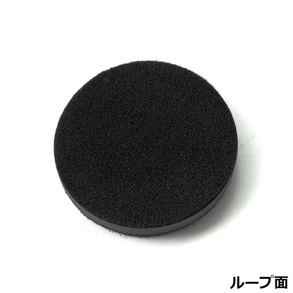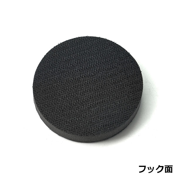 Φ75mm軸付サンディングパッドとの接続例。パッドとマジック式丸型サンドペーパー(別売)の間に、このスポンジアダプターを挟んで取り付けます。