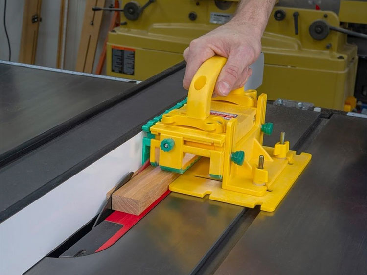 3Dプッシュブロックのサイドレッグの外側に、1/8′′ レッグを取り付けて、テーブルソーのフェンスと、鋸刃の間を通過させます。