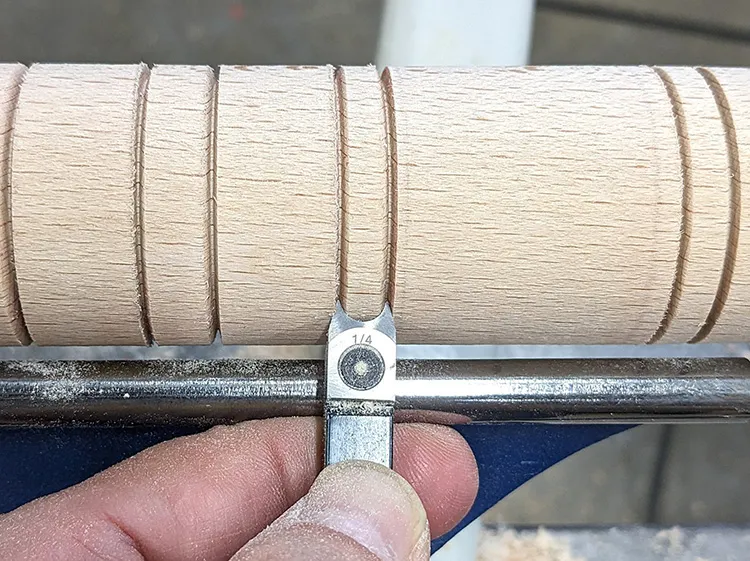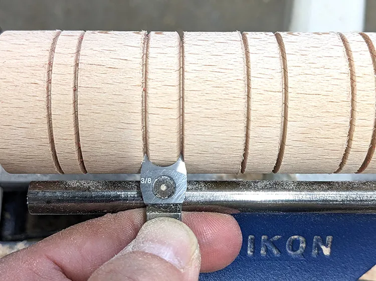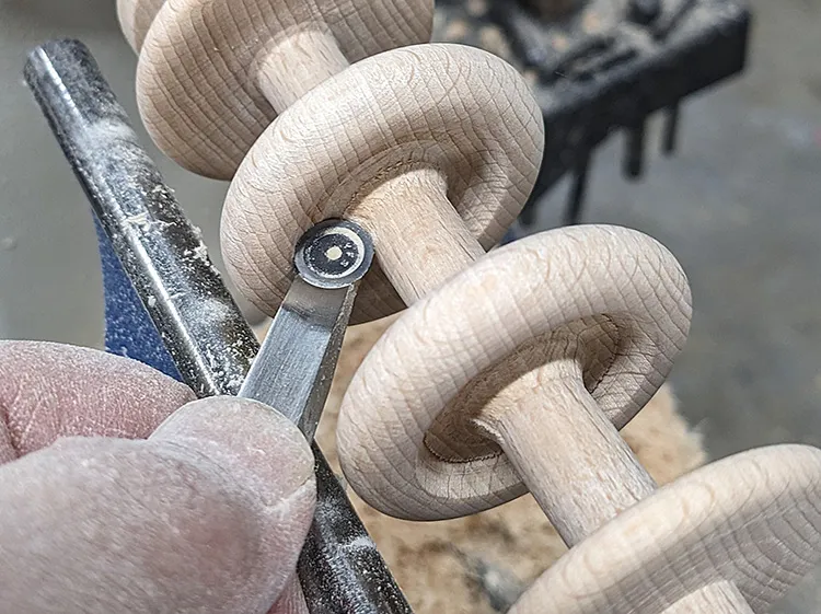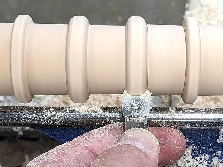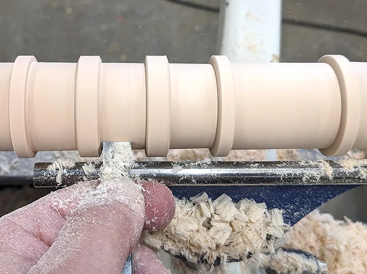 ② イージースタートラッファー(四角)で角材を円柱に仕上げた後、3/8" ビーディングカッターで2つのリング、1/4" ビーディングカッターで両端の皿とグリップ末端の当たりを付けます。