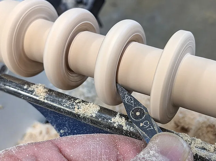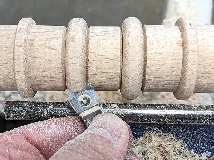 その後ディテーラー(菱形)でリングを切り離しますが、切り離したリングは以降旋盤加工ができないので、切り離す前に必要に応じてサンディングするなど、できる限り仕上げておきます。