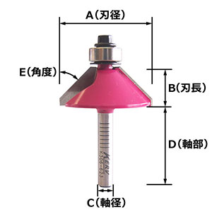 | 軸径(C) | 角度(E) | 刃径(A) | 刃長(B) | 軸長(D) | ベアリング径 | 品番 |