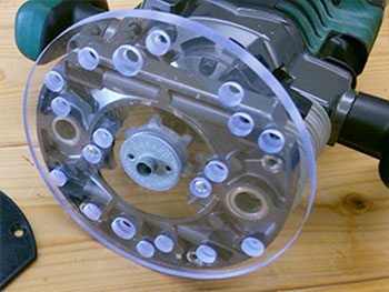 しかし、写真のようにルーターのベースにあいている穴が大きなルーターはテンプレートガイドブッシュを直接取り付けることができません。