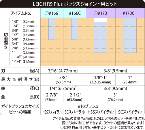 ※切削深さ(B)はビットの最大の数値ではなく、ジグで使える数値を表示しています。
