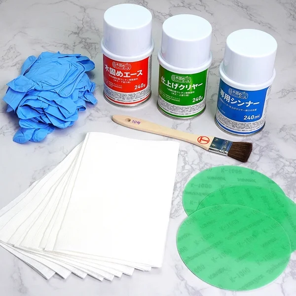 木固めエースとの相性を考えて作られたオリジナルの一液型ポリウレタン樹脂塗料。肉厚な塗膜を形成し、木製品の耐摩耗性や耐水性などの物性を向上させる造膜性のトップコートです。