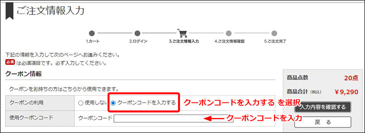 ②ご注文情報入力画面に進み、クーポン情報の項目で「クーポンコードを入力する」を選んでください。