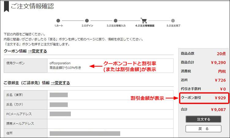 ※カートの内容を確認する画面では、まだクーポン割引は適用されません。