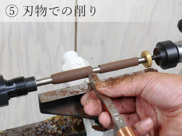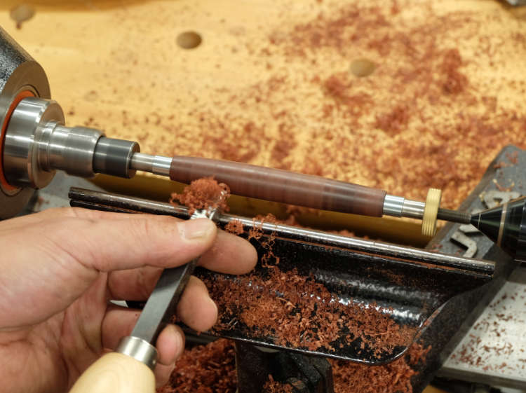 旋盤上で回転するワークに刃物をあてると、シュルシュルと小気味良い音を立てながらみるみるうちに思いのままにカタチが変わっていく。