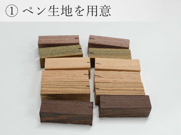 ナチュラルウッドペン生地 4種各1本 オーク、ブラックウォルナット、メープル、ゼブラウッド。個性豊かな無垢のペン木地。 |