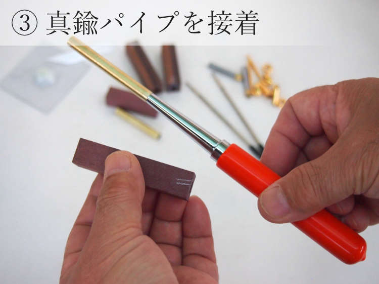 エポキシ接着剤&ペンパイプツール ペン生地に真鍮パイプを接着するエポキシ系接着剤と、パイプの挿入に便利なペンパイプツール。 |