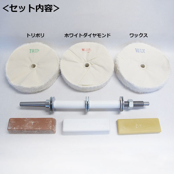 荒磨き用のバフ(トリポリ)、中磨き用のバフ(ホワイトダイヤモンド)、ワックス用のバフがセットになっていますので効率よくバフ作業が行えます。